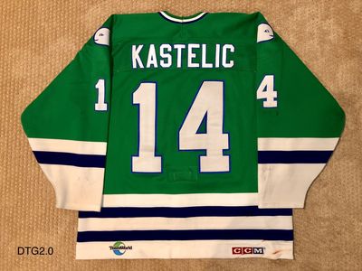 Kastelic wore this jersey before embarking upon a successful 3 year run in the NHL with the Hartford Whalers; his NHL efforts in total yielded 719 penalty minutes in only 220 games.